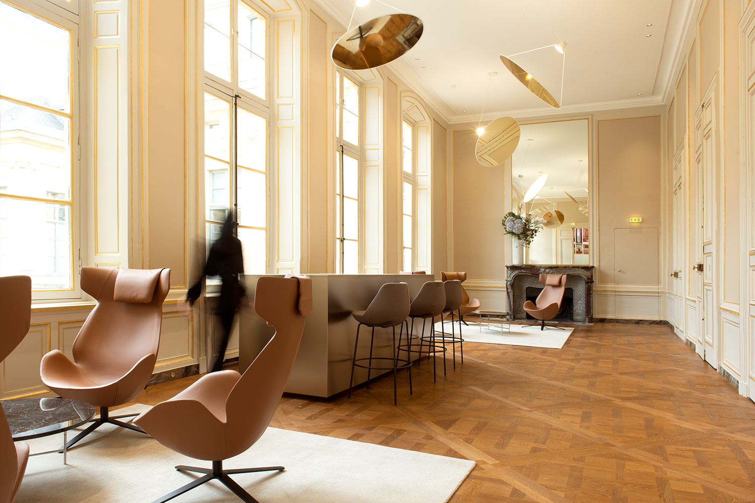 – Concevoir une identité remarquable et unifier 2 bâtiments très hétéroclites, l’hôtel d’Evreux, magnifique bâtiment inscrit aux Monuments Historiques, et un deuxième bâtiment de 2 étages en sous-sol sans réelle qualité architecturale ni lumière du jour.